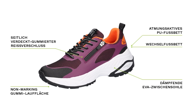 Das atmungsaktive PU-Fußbett sorgt für eine optimale Belüftung und ermöglicht ein angenehmes Fußklima während des Tragens.DÄMPFENDE EVA-ZWISCHENSOHLE